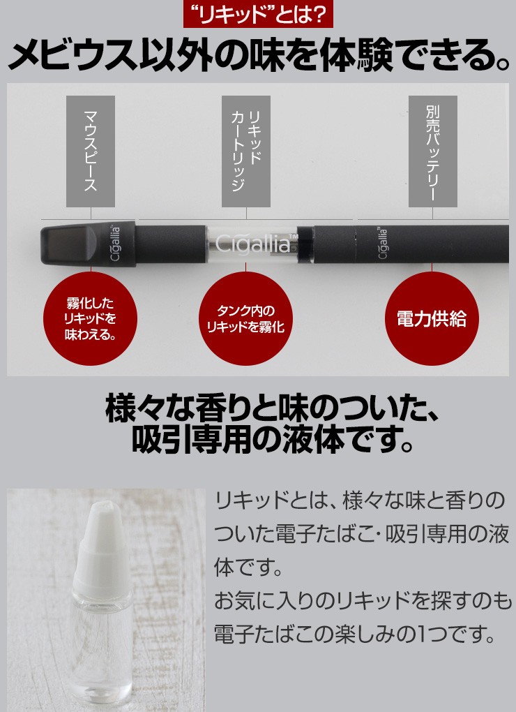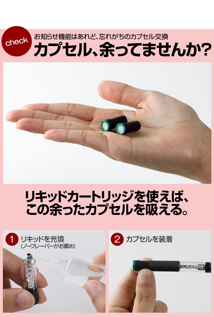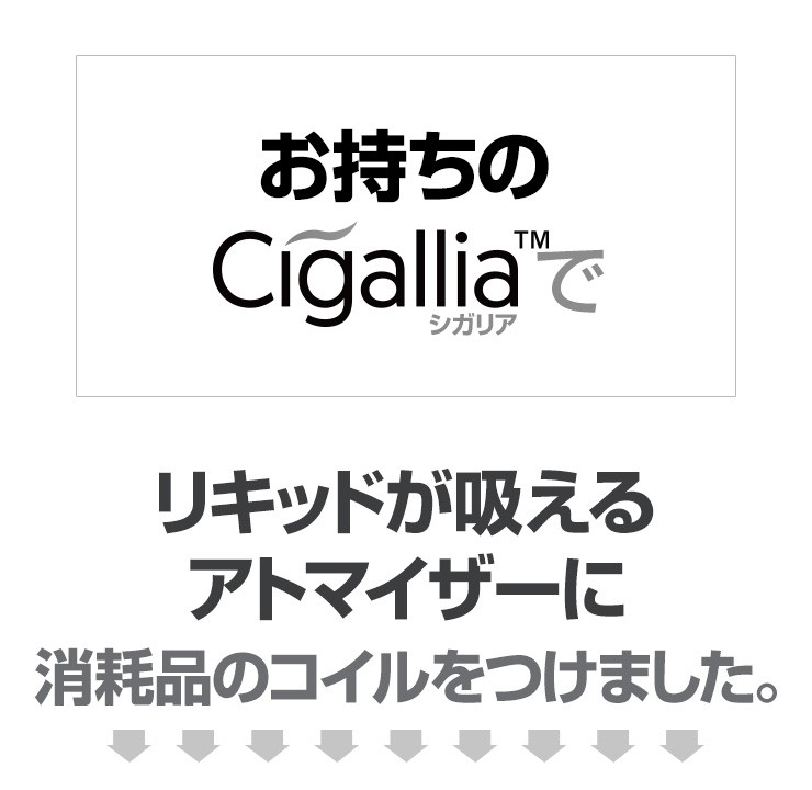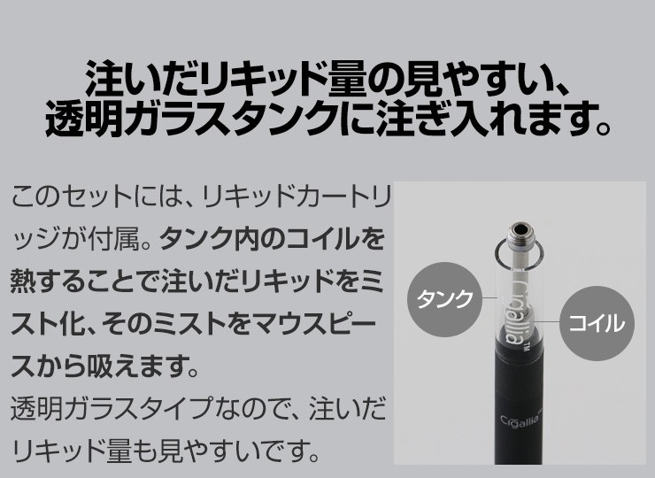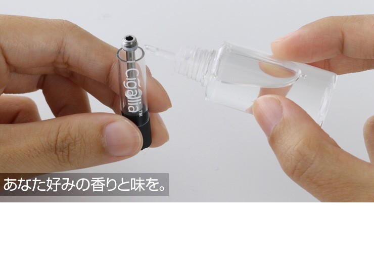 | 注意事項 | シガリアとの接続箇所内部にはコイルが内蔵されており、そのコイルでリキッドを加熱し気化したミストを吸うことができます。そのため、リキッドを入れて接続直後は気化が足りずに、十分なミストが出ません。はじめてリキッドを入れる時は、20〜30分ほど時間を置き、リキッドが馴染んだあとで吸引をお願いします。 ※コイルのネジ先端に穴が空いていますが、ここにリキッドを入れると故障の原因となります。 ※逆さまの状態で使用すると、コイルが空焼きになり故障の原因となりますのでご注意ください。 ※取扱説明書をよくお読みになりご使用ください。 リキッドカートリッジはガラス製です。 |