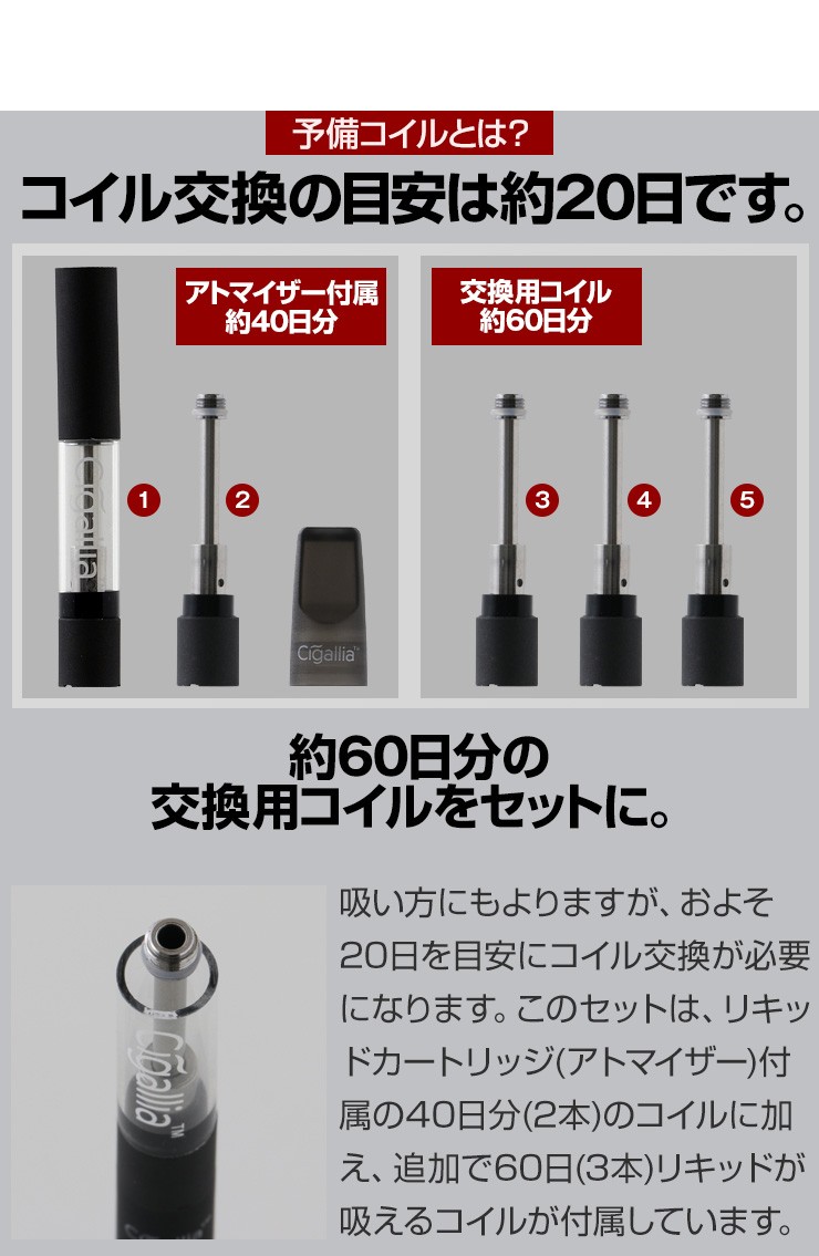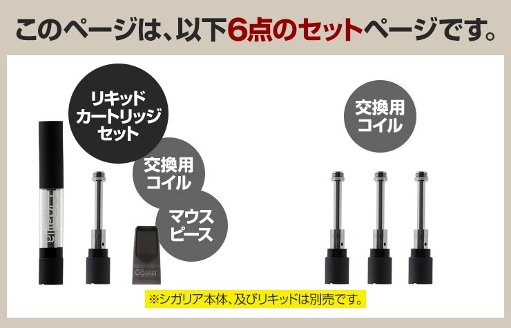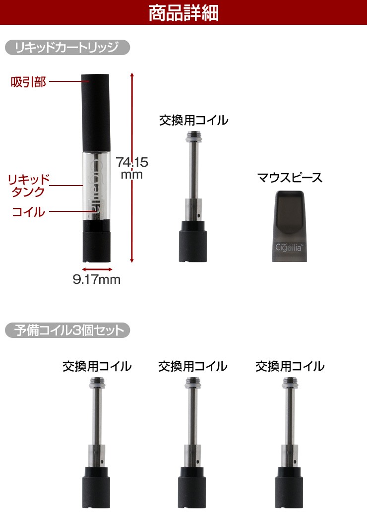 | セット内容 | リキッドカートリッジ、交換用(予備)コイル4本、マウスピース |