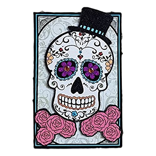 - Crafted of wood composite Features gentleman sugar skull Hues of black, white, pink, green, and purple Accented with gems and glitter Easel back for support Care: Dust with soft, dry cloth
