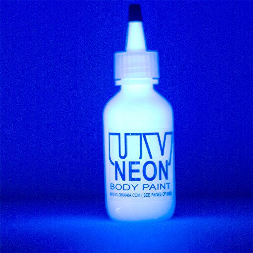 INVISIBLE UV Black Light Body Paint. This is a theatrical UV Black light body paint that is invisible under normal lights but fluoresces back under UV Black Light. You are purchasing a 1oz bottle of Body Paint in WHITE. PLEASE NOTE: THESE ITEMS ARE NOT GLOW IN THE DARK- THEY ARE UV FLUORESCENT ONLY. This will cover approximately 2 sheets of standard paper. Place on the body and leave to dry before placing a second coat. Because of its texture and viscosity it can be thinned down and used in an air brush for Temporary Tattoos. Use this color on its own or mix with our other range of UV visible & invisible body colors. GREAT for those nights out, parties, Halloween, Disco, Rave, Body Pimping. You cannot purchase these paints in any retail store, manufactured and distributed through GlomaniaUSA. Product can be removed with warm soap and water. WARNING: This product may stain and is NOT a permanent makeup. Do not place near eyes or use internally. WARNING: Test a small area for sensitivity before using. GloMania will not be held responsible for any misuse of these products. Do NOT use if you have any allergic reactions- wash off immediately with warm soap and water or any makeup remover. ALL PHOTOS/IMAGES ARE PROPERTY OF GLOMANIA & PROGLOW USAFeature