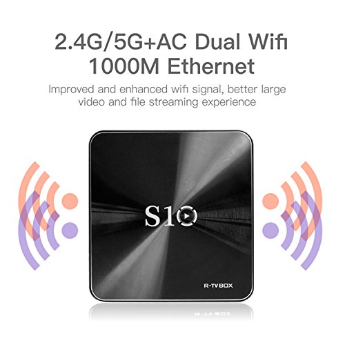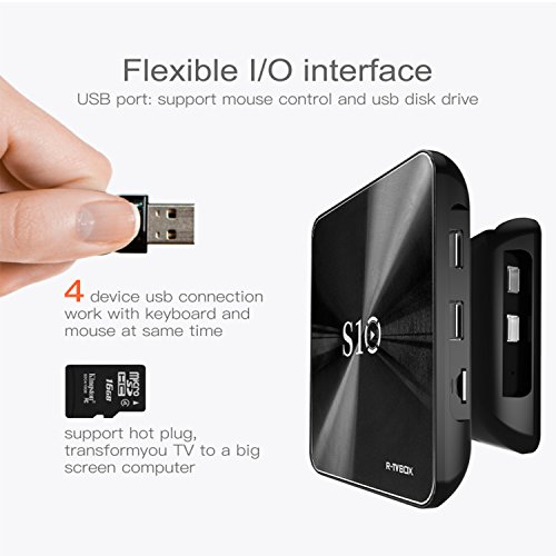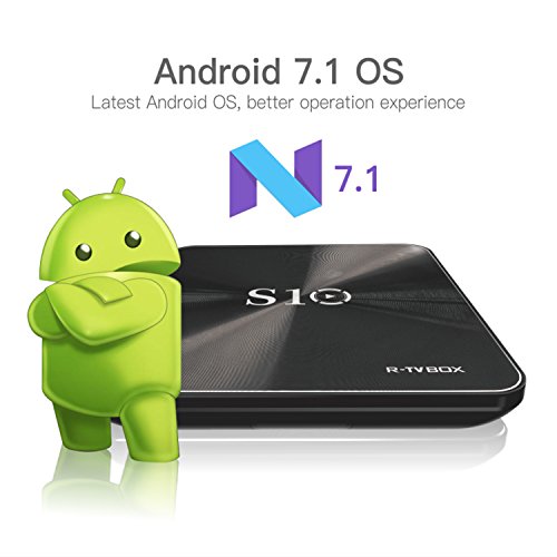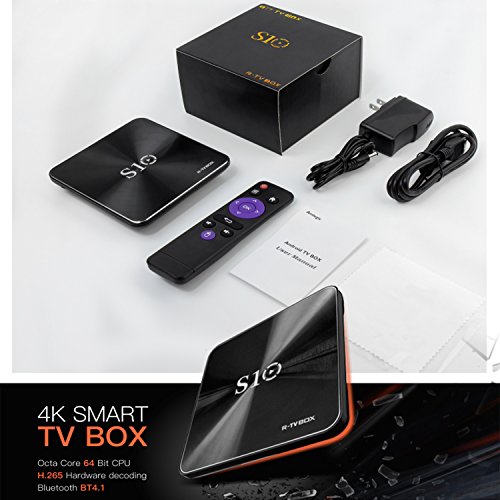 -. Feature : Latest Amlogic S912 chipset - more advanced in technology and configuration compared to the previous S905 chipset, supports both H.265(HEVC) and VP9 decoding. Its powerful CPU & GPU make it run faster than the normal S905 chipset. Also could support HDR Vivid World, you can watch videos in detail like never before with select HDR content. Witness scenes and characters come to life in vivid contrast, color, and clarity. / Stable, Fast and High Quality WIFI signal - Professional H.265 video decoding technology and WIFI 2.4GHZ, offering a more stable WIFI signal to enjoy a higher quality video experience. 3G RAM/ 32G ROM gives you more space to download your favorite program and caches to browse websites, play games, watch movies more smoothly. / Android 7.1 OS - the NEWEST Generation of android player. Stable configuration coupled with the highly customized android 7.1. You can watching movies, browsing webpage and photos, and playing android games with your family. / Easy connection and operation - Android R-TV BOX S10 has HDMI and AV out port. You simply plug the box into your device by HDMI for HD device or RCA for standard definition. 4 USB ports, connect with your mouse and keyboard to help you operate more conveniently. Infrared remote control lets you enjoy your wonderful life which the wireless brings to you. / Best accessories - R-TV BOX S10 TV BOX comes with HDMI Cable, Remote controller, Charger and User Manual.