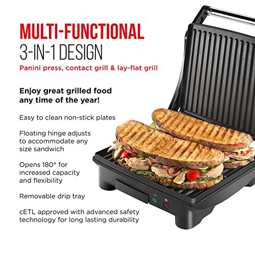 The Chefman 4 Slice 180 Grill + Panini Press is designed like professional units. Its floating hinge adjusts to accommodate any thickness for perfectly grilled thin or thick panini's and sandwiches, while the lay-flat grill is also perfect for grilling meats, vegetables and fish (to lay flat, just push the button on the side). The Chefman 180 Grill + Panini Press makes quick meals and is easy to clean. The grill-surfaces are coated with an easy-to-clean nonstick surface, and the grill is equipped with a dishwasher-safe drip tray. This unit is perfect for making breakfast, lunch, dinner and more!