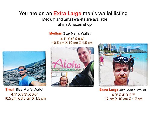 Binding : Apparel Product Description Extra LARGE size custom wallet for men made using pictures from you. Covered with clear plastic for protection. Make sure that your images are in good quality and not blurry. For this wallet we will need from you either 2 or 3 pictures. Have an idea but can't find the pictures of it? Let us know and we will try to find it for you. Dimensions of the wallet in Inches: 4.9" X 4" X 0.7" Dimensions of the wallet in centimeters: 12 cm X 10 cm X 2 cm Features 13 slots for cards, 2 slots for cash, pocket for coins, a clear slot for an easy showing of docs/cards. Personalized wallets for men are also available in medium size and small size at my Amazon shop 0