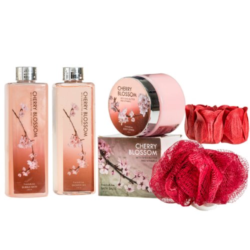 - Contents: 250ml shower gel 250ml bubble bath 120g bath salt 140ml body lotion 1 puff 4 soap rose Enhanced with Shea & Vitamin E
