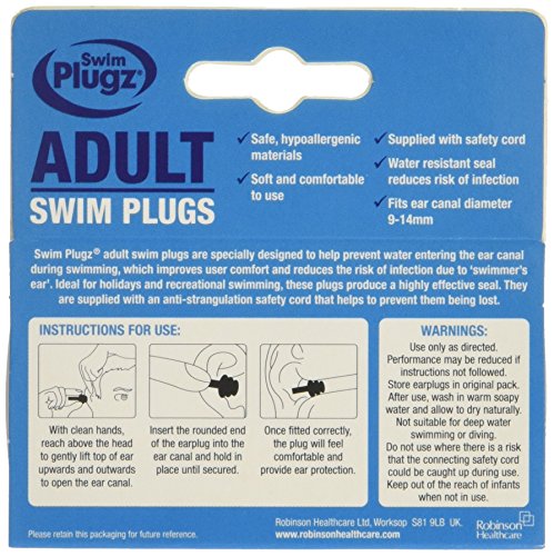 Studio : Swim Plugz Publisher : Swim Plugz Binding : Health and Beauty Product Description Swim Plugz are high quality swimming earplugs designed to help prevent water entering the ear canal to reduce the risk of infection or reduce pressure. These earplugs are a tried, tested and effective method for use when on holiday or during recreational swimming. They are very easy to fit and seal the ear canal to help prevent entry of water. All pairs are fitted with a safety cord. Even good earplugs will not work effectively if they are not fitted correctly. All Swim Plugz packs contain clear, easy to follow diagrams to ensure that users fit the earplug correctly and obtain optimum benefit and satisfaction from the product. The earplugs are supplied with a re-usable pocket sized carry case. The carry case is highly durable, making it ideal to protect the earplugs when travelling or on the move. Improves comfort by minimising water pressure and risk of infection Fits ear canal diameter 9mm - 14mm Ideal for holidays and recreational swimming Value for money 2 pair pack Supplied with safety cord to help stop plugs being lost Durable, pocket sized carry case Attractive and informative pack design for maximum impact Retail ready shelf packaging with euro hook slots to aid merchandising 0