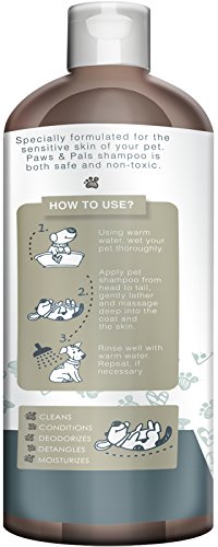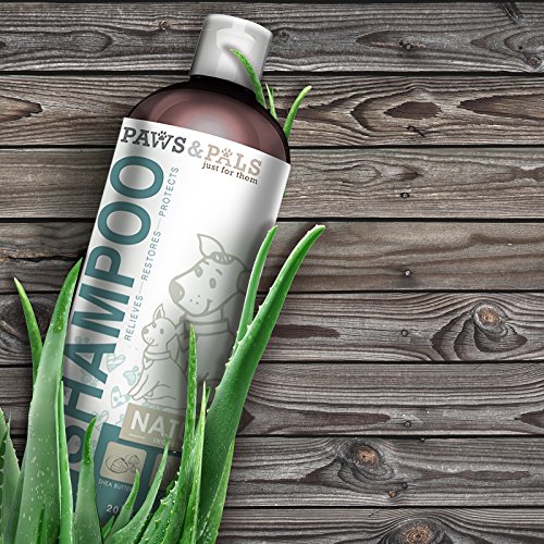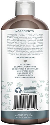 Paws & Pals's 100% All Natural Pet Wash Shampoo, Specially formulated for the dry, sensitive, skin and coat of your dog. All Natural Cleansing and Moisturizing for You and Your Family's Best Friend. 100% Natural Oils for deep cleansing and moisturizing of your dog's coat and skin. Vegan Ingredients, Nontoxic and safe for your dog and your family. All natural aloe, jojoba and coconut oils relieve painful and itchy skin caused by fleas, dander, and dryness. Oatmeal, Shea Butter, Rosemary combine to smooth and moisturize even the most brittle coat, leaving your dogs fur clean, smooth and odor free. Tearless soap free formula makes for a hassle free painless bath time. Brings restored shine and health to your dog's matted or worn coat. Paraben Free, and of course Cruelty Free. 20 Oz. bottle made with certified recycled materials. Proudly Made in the U.S.A.