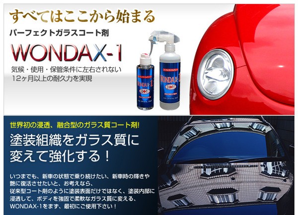 いつまでも、新車の状態で乗り続けたい。新車時の輝きや艶を復活させたい、とお考えなら、従来型コート剤のように塗装表面だけでなく、塗装内部に浸透してボディを強固で柔軟なガラス質に変える、WONDAX-1をお試しください・