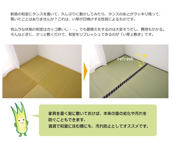 い草生地の両面に撥水加工を施した(ただし、お湯・お茶・コーヒーなど40℃以上の水分ははじきません)上敷です。上敷きを敷くだけで畳のお部屋をリフレッシュ出来ます。日焼けしてしまった畳のリフレッシュに、新品の畳を汚さない為のカバーにご使用下さい。一般的なイ草上敷はご使用の前に乾拭きが必要ですが、本商品は生地に泥染めをした上から撥水のコーティングをしているため、乾拭きの必要がありません。届いた商品を広げて頂いてそのままご使用頂けます。生地の表裏両面に撥水加工を施しています、両面使用可能で経済的なリバーシブルです。本商品は長さ105~110cm程のイ草を使用しています。そのうち約88cmを使用しています。ヘリ際がある程度白みを帯びます。(日焼けではありません。い草の根元と先端部分の色です。)イ草は長いものほど高級になります。イ草は先端部分が赤茶色く、根元が白く真中が青(緑)色です。真中の良質な青の部分を多く使用するほど、丈夫で綺麗な仕上がりとなります。い草には空気の清浄作用、湿度の調節作用があり、汚れにくいといった特長があります。青森県のヒバの木から抽出した「ヒバエッセンス」をメーカー独自の技術で生地表面に加工しました。ヒバエッセンスにはヒノキチオールという、天然物物質としては極めて抗菌性の高い成分が含まれています。(無加工品に比べ抗菌、防臭効果があります。)※自然素材であること、また職人が一つ一つ手作業にて加工を行うため、形状のバラツキや表示サイズと多少異なることがあります。※撥水加工の工程上、イ草生地が若干赤みを帯びております。予めご了承頂きますようお願いします。