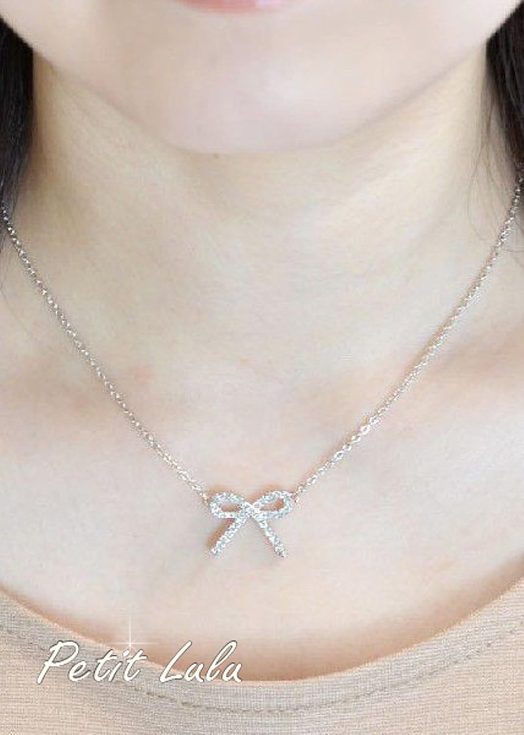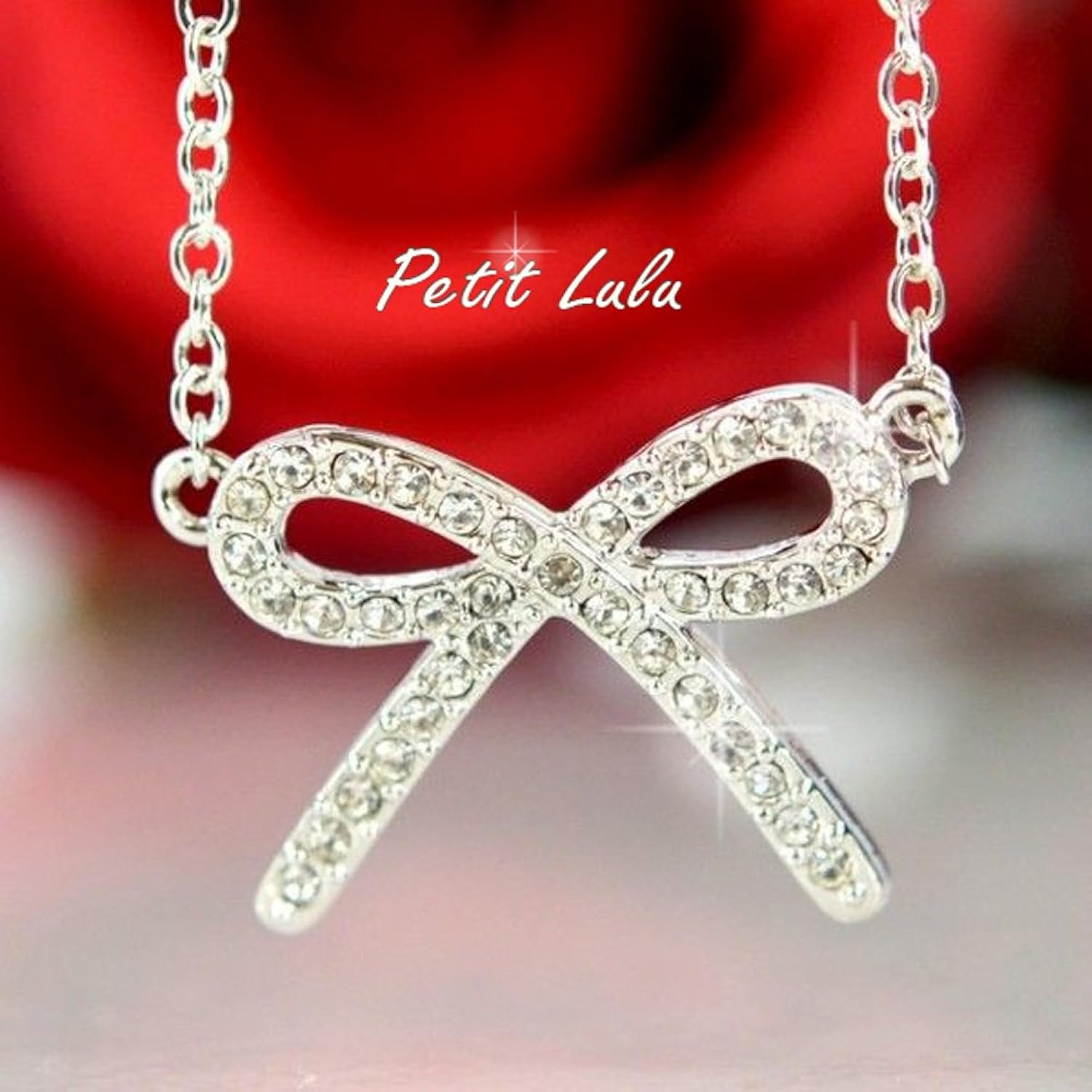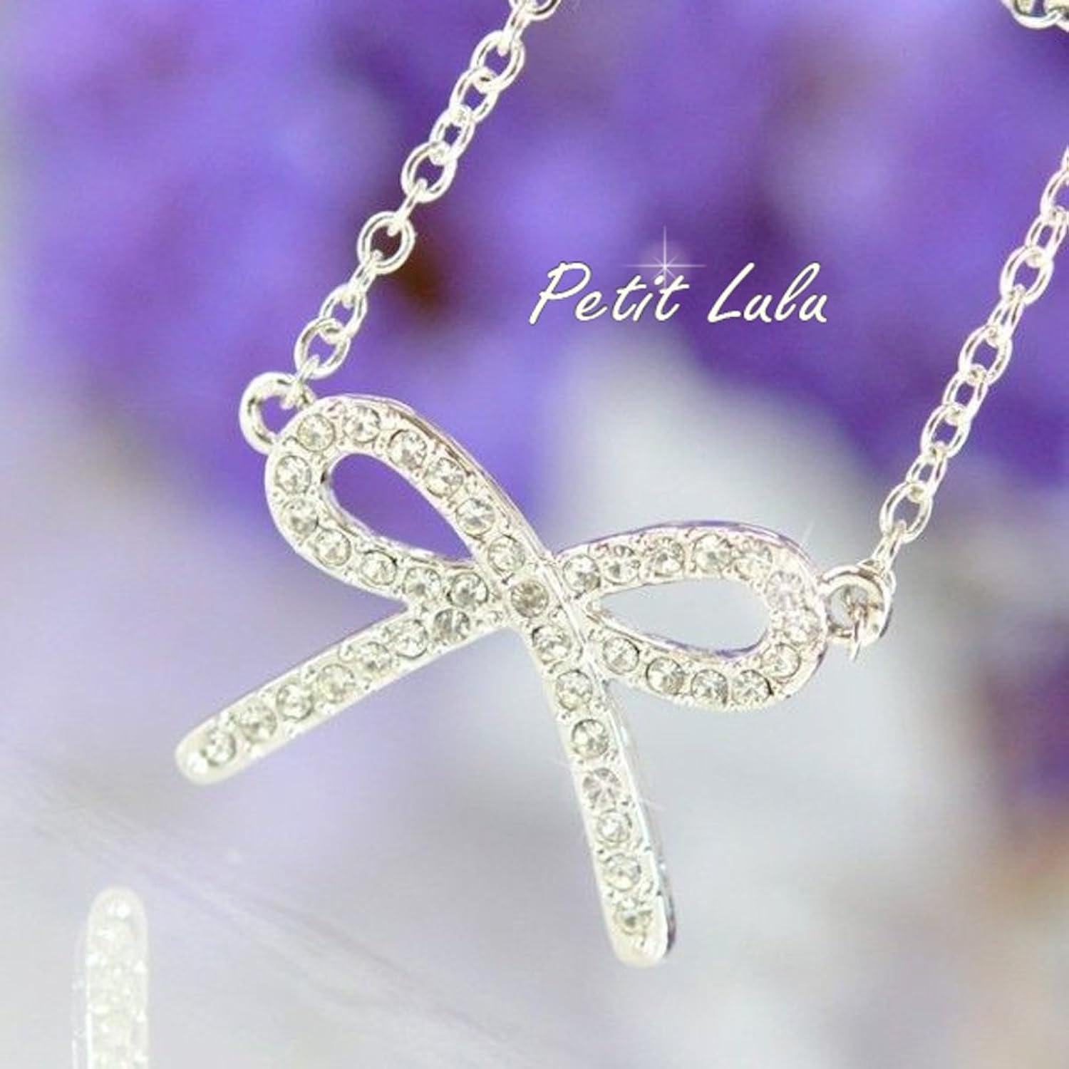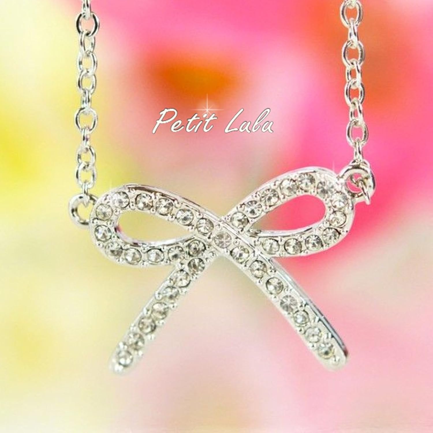 たくさんのスワロフスキーをあしらったリボンモチーフのネックレス大きめのリボンで可愛さが増す事間違いなし!