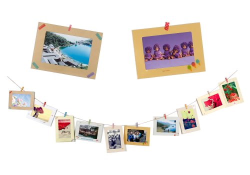 Set comes with: 10 frames, 10 mini multi-color wooden clips, 2 hemp ropes and 6 to 8 sheets of decorative stickers. Color frames & sticker sheets design may differ to what is in stock.