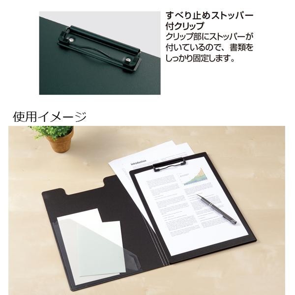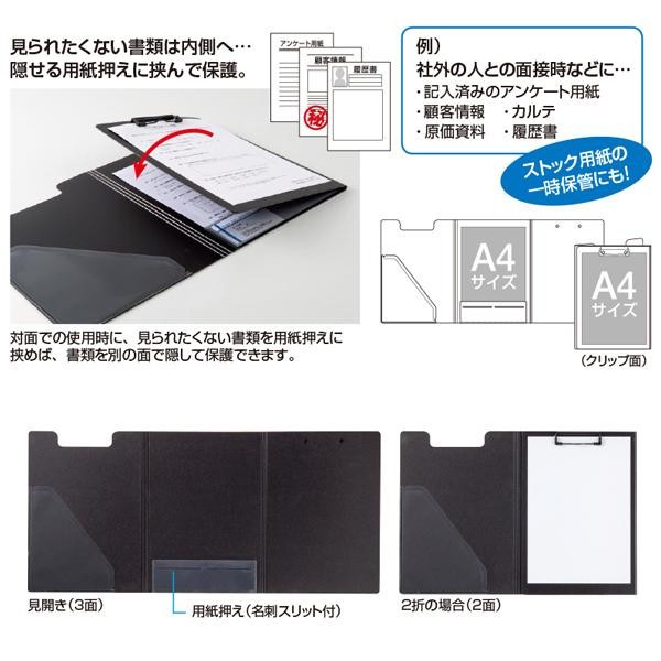 | しっかり固定できるクリップ、メモなどが挟める内ポケット、360度折り返せる表紙。不透明なので、閉じると書類が見えません。クリップ部にすべり止めストッパーが付いているので、書類をしっかり固定します。 |
