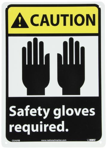 NMC CGA8RB OSHA Sign, Legend "CAUTION - Safety gloves required." with Graphic, 10" Length x 14" Height, Rigid Plastic, Yellow/Black on White