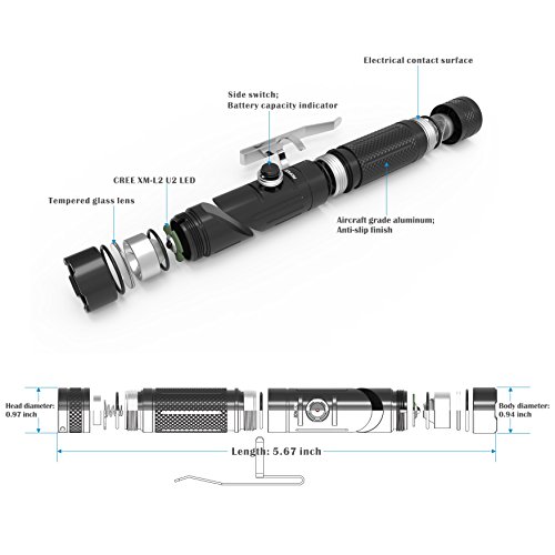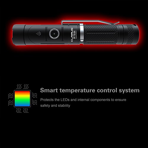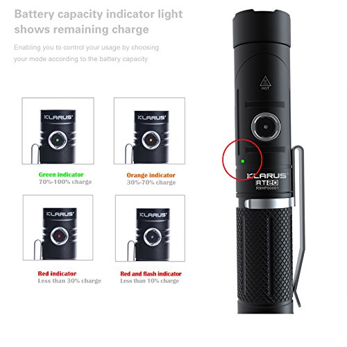 -. Feature : PATENTED ADJUSTABLE HEAD and UNIQUE MAGNETIC FUNCTION - With a beam angle of up to 90 degrees according to requirements, it is suitable for a variety of applications which include cars, bikes, home, etc.; you can affix it to a metal surface using the magnetic interface at the bottom to get 'hands-free' illumination. Whenever there is a blackout or any emergency, you know you can always trust KLARUS RT20 with its high lumen LED light and easy to use features / ULTRA BRIGHT ILLUMINATION & INTELLIGENT CAPACITY REMINDER - Equipped with CREE XM-L2 U2 LED which provides Ultra Bright 1050 lumen output and up to 500 feet beam range, RT20's 18650 rechargeable battery offers 1 Hour 40 Minutes of runtime on High mode and 220hrs on Low mode! Battery capacity indicator light displays remaining charge, enabling you to control your lighting time by choosing the mode according to the battery capacity / SMART LOCK TO GIVE YOU A PEACE OF MIND - Side switch incorporates a specially designed lock function to prevent accidental illumination. This precludes power drainage during storage or traveling and prevents eye damage should children play with the flashlight / USER FRIENDLY CHARGING - Recharge rapidly and conveniently using any USB port at home, in the office, airport, vehicle or anywhere that has a USB charging port available. Easy to carry around without any bulky recharger / WATER RESISTANT and IMPACT RESISTANT. IPX-8 Waterproof (2 meters submersible); Made of high-strength aircraft grade aluminum with Mil-Spec hard anodic oxidation for superb durability and versatility, KLARUS RT20 is ready to handle whatever life throws at it
