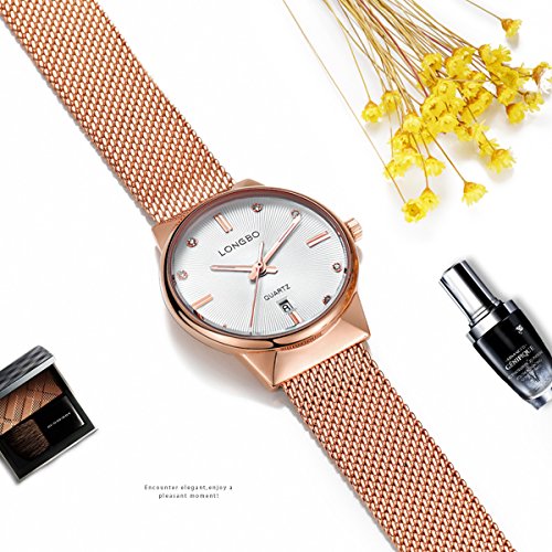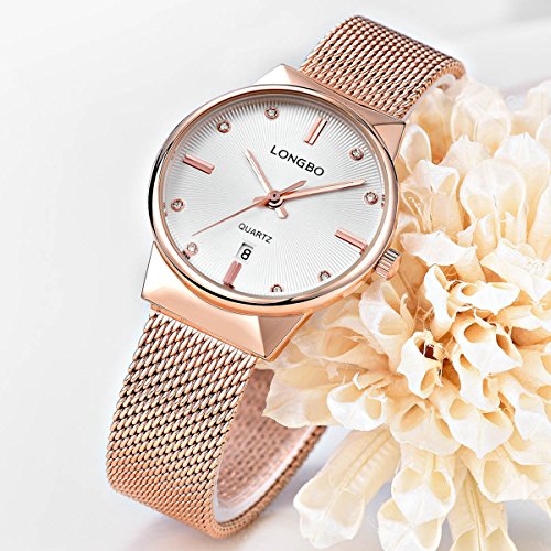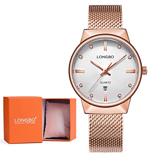 -. Binding : Watch -. Brand : LONGBO -. Color : Pink -. Department : womens -. Feature : Precise Time Keeping (Elegant/Fashion Style) / Suitable For Wear In Business/Outdoor (Box Package) / Elegance Style With Stainless Steel Band, Rose Gold Plating- Diamond Face / Original Japanese Quartz Movement Business Casual Combine With Auto Date / This is a perfect casual and pretty watch for you. Also make it a great gift for family or friends or lover -. Label : LONGBO -. Manufacturer : LONGBO -. MPN : 5028L-RG01+800001C -. PackageQuantity : 1 -. PartNumber : 5028L-RG01+800001C -. ProductGroup : Watch -. ProductTypeName : WATCH -. Publisher : LONGBO -. Studio : LONGBO -. Title : LONGBO Luxury Women's Rose Gold Metal Mesh Strap Analog Quartz Business Watch Auto Date Calendar Elegant Watch Waterproof Rhinestone Dial Wristwatch For Woman