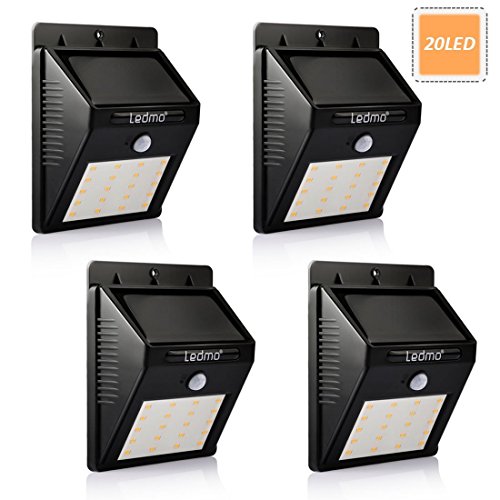 LEDMO 4-Pack Solar Lights Outdoor Motion Sensor 20 LED Warm White Garden Security Night Light Wireless for Pathway Gutter fence Wall Patio Backyard Walkway