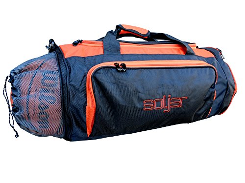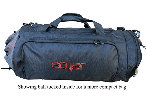 Image shows ball sticking out, however, ball can be pushed into the bag making it more compact. Exterior net for basketball and/or wet clothes. Can hold two balls. One in the net, the other in the main compartment.