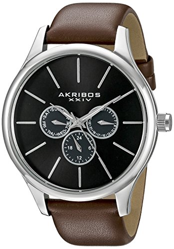 -. Binding : Watch -. Brand : Akribos XXIV -. Color : Brown/Black -. Department : mens -. EAN : 0848572072120 -. Feature : Radiant black sunburst dial with three hand movement with date subdial / Individually hand applied silver tone stick index with silver tone dauphine style hands / Polished stainless steel case with brown genuine leather strap / Quartz movement with analog display / Water-resistant to 30 M (100 feet) -. Label : TWI Watches, LLC -. Manufacturer : TWI Watches, LLC -. Model : AK870BR -. MPN : AK870BR -. PackageQuantity : 1 -. PartNumber : AK870BR -. ProductGroup : Watch -. ProductTypeName : WATCH -. Publisher : TWI Watches, LLC -. Studio : TWI Watches, LLC -. Title : Akribos XXIV Men's AK870BR Round Black Dial Three Hand Quartz Stainless Steel Strap Watch -. UPC : 848572072120