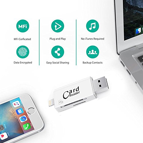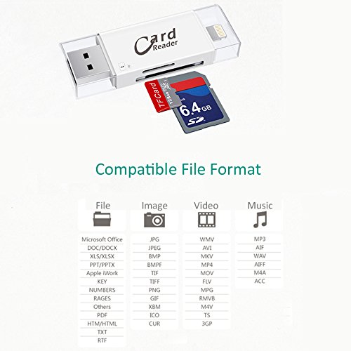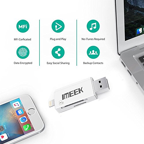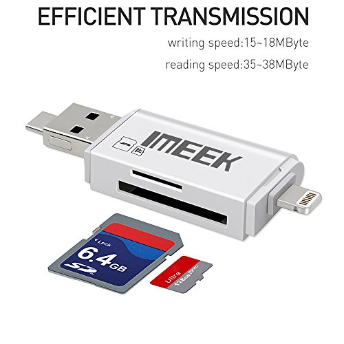 -. Feature : IMEEK Card Reader with three interfaces: Lightning connector is for iOS devices; Micro USB connector is for Android devices; USB connector is for computers/Macs / Manage your data directly on the Free APP(create copy move delete rename open in and many more); Playback videos/music, backup and restore your contact list, document viewer for all major file formats, voice recorder and text editor via card reader from SD card / Support 8G~128G SD and TF card(Memory Cards are NOT Included). Reading speed: 20~27M/S; Writing speed: 11~20M/S / While in travelling, you can send the photos that you took with camera via card reader from SD card to your cell phone and share the beautiful moments of your journey / 12 months worry-free product guarantee for every purchase from IMEEKTECH and professional technical support and always satisfied customer service 24 * 7 available