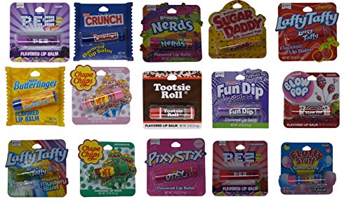 15 party pack of your favorite flavored lip balm One of each Fluffy Stuff Cotton Candy, Laffy Taffy Mystery Swirl, Pez Red Cherry, Pixy Stix Strawberry, Chupa Chups Watermelon, Nerds Rainbow, Laffy Taffy Cherry, Pez Purple Grape, Fun Dip Grape Yumptious Dip, Chupa Chups Strawberry & Cream, Sugar Daddy Milk Caramel, Nestle Butter Finger, Nestle Crunch, Tootsie Roll, and Charms Blow Pop (Cherry)!