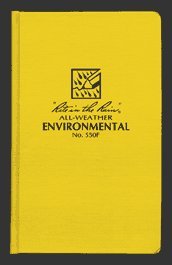 "Rite in the Rain" 550F Environmental Bound BookRite in the Rain 550F All-Weather Bound Environmental Book w/ Fabrikoid (yellow) Cover 4 3/4" x 7 1/2" "Rite in the Rain" Bound Books ensure that your valuable data will not be lost. The numbered page, sewn bound book meet U.S. E.P.A. guidelines and are legally defensible in case of litigation. They contain 10 helpful environmental reference pages. This book has 160 pages (80 sheets). Size - 4 3/4" x 7 1/2" Page Pattern - Environmental Binding - Sewn Cover - Fabrikoid (yellow) Pages - 160 (80 sheets) Weight - 0.65 lb. EA Stock No. 550F