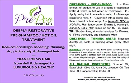 Stress, medications, age, bad relaxers, bad weaves, tight braids and damaging products can cause hair thinning and hair loss. PrePoo For Hair is an All Natural, premium blend of oils that help stimulate hair follicles while reducing shedding, breakage, dryness and tangling caused by the shampoo process. For thinning areas, especially thin edges and thin crown, massage on the scalp area every other night - after about 2 weeks you should begin to see a change. Also use as a pre shampoo treatment to reduce dry, itchy, flaky scalp and dandruff which aids in hair loss prevention. The Scent - a web search on Garlic For Hair shows its benefits for hair health. You can smell the garlic, but you will use only a few drops on the thin areas of your scalp so it will not be noticed. When using as a pre poo / hot oil treatment on all of your hair you will be shampooing it out. Artificially drowning the garlic smell will dilute the effectiveness of our nutrient rich blend. The Price - cheaper products use cheap, artificial, chemical ingredients. Our product is made with all natural, premium ingredients including Coconut Oil, no chemicals, no artificial fragrances, no coloring, no sulfates, no silicones, no sls, no harmful ingredients. There is a smaller 2 oz size available. Works with your current cleansing products, you do not have to stop using them or purchase a new hair system for your hair to benefit. Made in USA, no animal testing. Fully guaranteed - not every hair product works for every body. Your money back if it does not work for you. We advocate a healthy hair movement that empowers people to grow and retain their own gorgeous hair without the use of weaves, wigs or extensions. The hair industry pushes us to spend money on too many hair products, but people are still struggling with their hair. PrePoo For Hair only makes one product. This treatment will enhance the effectiveness of your other products and become an essential part of your healthy hair care routine.Feature
