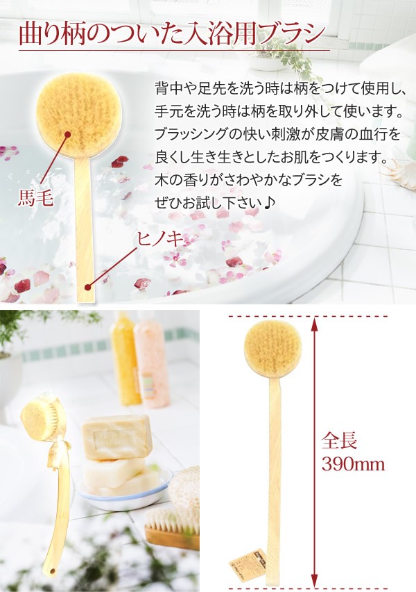 | 曲り柄のついた入浴用ブラシ。背中や足先を洗う時は柄をつけて使用し、手元を洗う時は柄を取り外して使います。ブラッシングの快い刺激が皮膚の血行を良くし生き生きとしたお肌をつくります。木の香りがさわやかなブラシをぜひお試し下さい♪ |