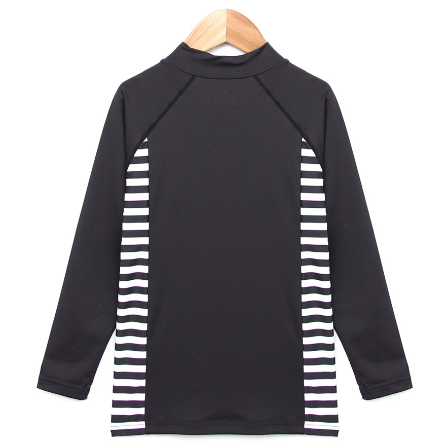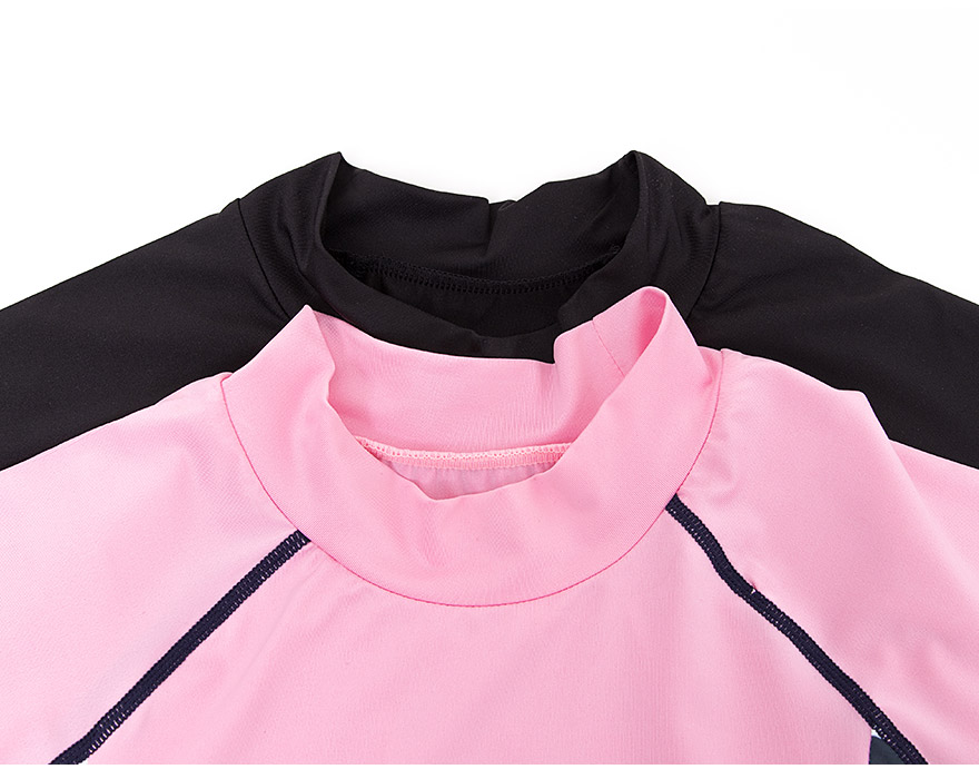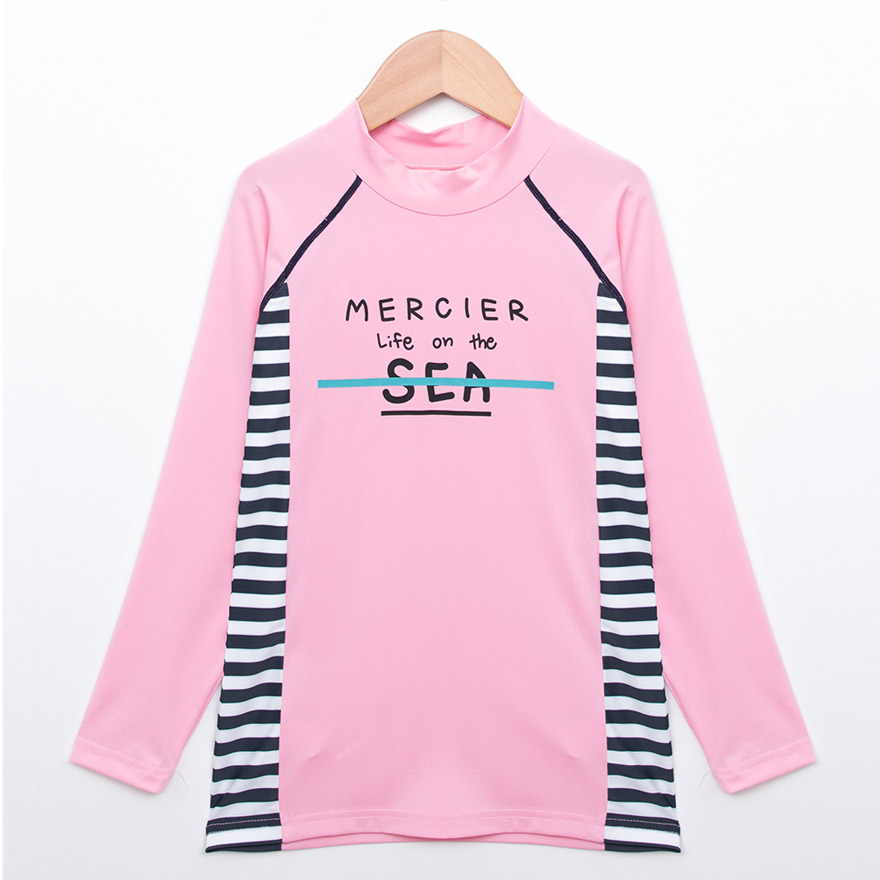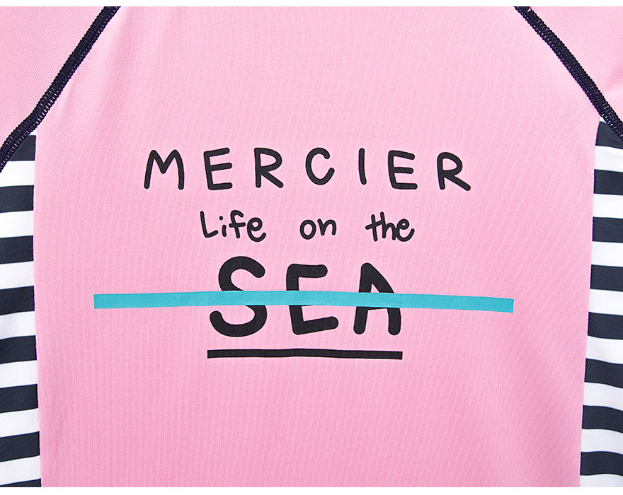 폴리에스터, 스판 혼방 원단으로 제작한 래쉬가드 티셔츠입니다. 가슴 쪽에 깔끔한 레터링 나염으로 포인트를 주었으며, 옆쪽에 단가라 무늬를 넣어 발랄한 느낌의 제품입니다. 또한 신축성이 좋아 활동하기 편안하답니다. 트렌디하고 스타일리쉬한 물놀이 코디를 위해 소장해보세요;)