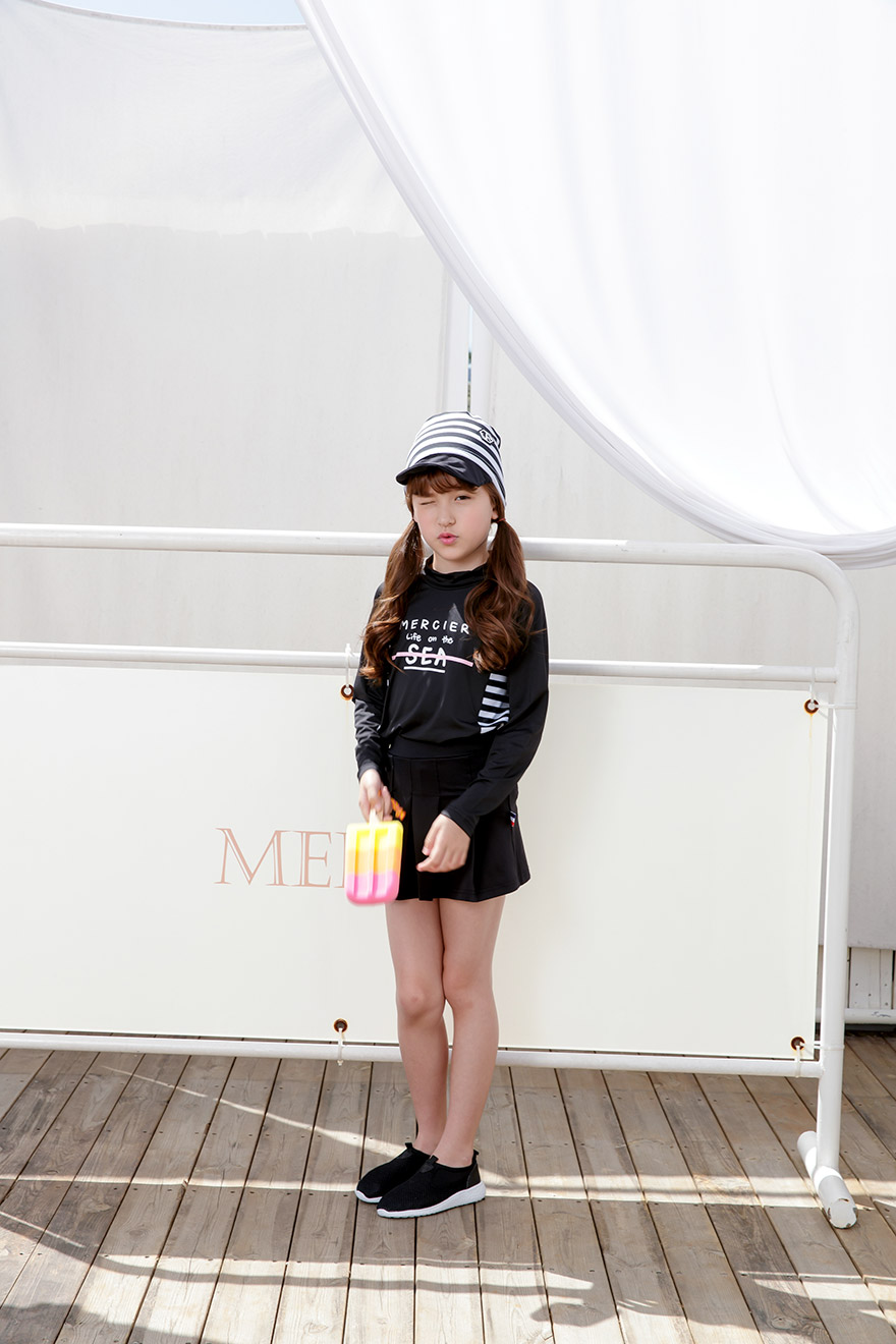 9, 11, 13, 15, 17호로 준비되어 있으며 하단에 측정된 사이즈 표를 참고해 주세요. 피팅한 여아 모델은 128cm에 20kg으로 다소 마른 체격이며, 딱 맞게 블랙 9호를 착용하였습니다. 깔끔한 핏으로 잘 맞네요 :)