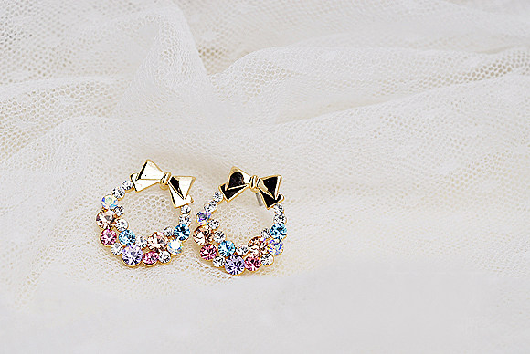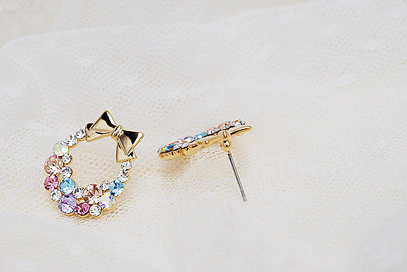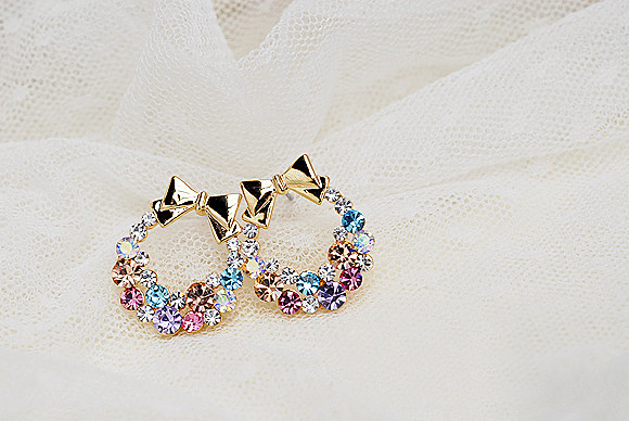 Korean jewelry fine diamond super flash bright and colorful diamond bow earrings earrings earrings Mosaic Material: Alloy inlaid artificial gemstones / semi-precious stones Condition: New New exotic: freshly baked Mosaic Material: not set Dimensions: Butterfly size 2.2X1.8CM Earrings size: 1CM