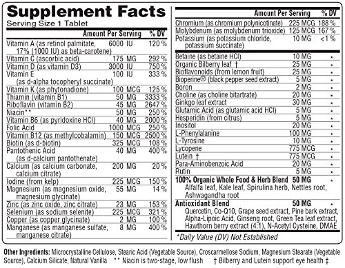 With 6000 IU of vitamin A (Retinol), 150 B-12, 3000 IU of D3, 175 MG of C, 200 MG Calcium, 100 IU of E and antioxidant blend, in an organic whole food and herbal based tablet.