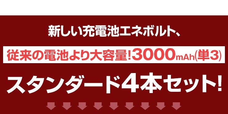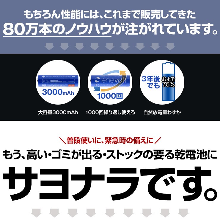 発表!累計80万8000本売れた充電池エネロングが新たに生まれ変わりました。その名もエネボルト。もちろん性能には、これまでの80万本のノウハウが注がれています。 【特徴】●強さ長持ち大容量3000mAh●1000回繰り返し充電して使えるので、お財布にも地球にも優しい。●自然放電量が少なく、フル充電から3年を経過しても、75%の容量が残っています。●メモリー効果が少なく、継ぎ足し充電に強い。●180日保証だから安心。※お買い上げ当初は満充電状態ではない場合があります。最適な性能を発揮できるよう、ご使用前に満充電状態にしてからご使用ください。●充電は、当社enevolt対応の充電器を使用して下さい。●外装ラベルを剥がしたり、傷をつけない。●新旧の電池や充電した電池と放電した電池の混用をしない。●強い衝撃を与えたり、投げつけない。電池切れになった電池を残量ゼロのまま放置すると、充電・使用できなくなる事があります。必ず1度フル充電状態にしてから保存して下さい。 デジキン
