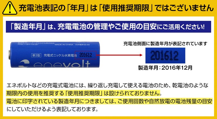 (充電池は繰り返し充電して使える電池のため「使用推奨期限」は設けられていないため。)