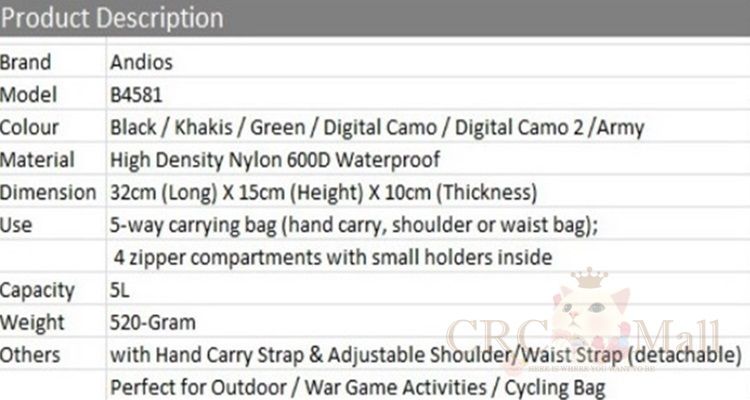 • Color: Black/Green/Army Digital Camo/Army 1/Army 2/Khakis