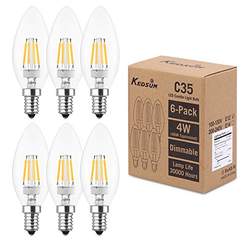 KEDSUM C35 Chandelier LED Filament Candle light Bulbs - Dimmable 4W 2700K 220LM Warm White (40W Equivalent), E12 Torpedo Edison Candelabra Lighting Bulb, Pack of 6 (compatible with partial dimmers)