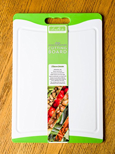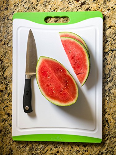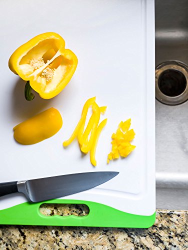 - Cutting board comes with a groove on one side for collecting juices from fruits, vegetables, fish, and meats and a flat surface on the other side giving you more cutting room.