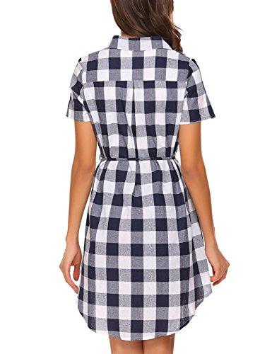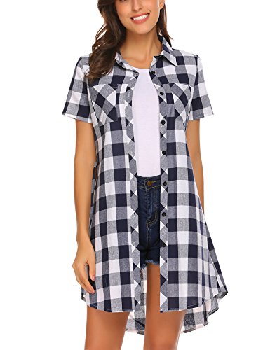Button down front closure, polo collar, short sleeves, high waist, plaid pattern.