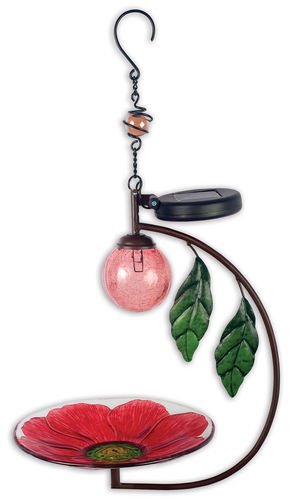 -. Feature : Hanging glass bird feeder with solar powered light / 12 x 8.75-Inch feeder hangs 19.75-Inch long / Blue flower feeder bowl hangs from a stylized metal stem / Whether as a gift or in your own garden, this lovely yard décor will be loved for years to come / Sunset Vista helps you add beauty and music to your home, office or garden space / 12 x 8.75-Inch feeder hangs 19.75-inches long