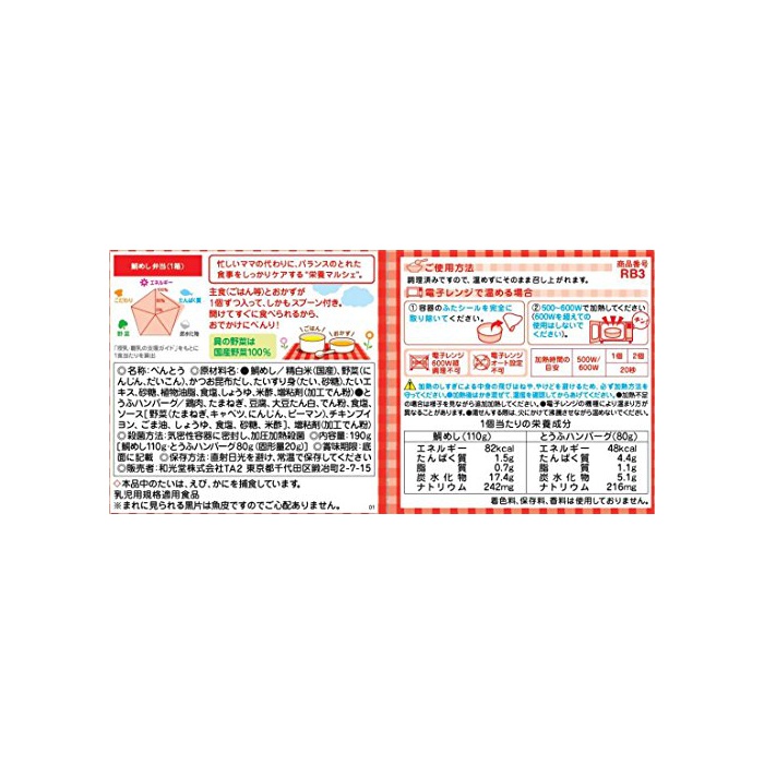원재료:●도미 밥/정백미(국산)고, 야채((당근)인삼,무우)고, 가다랭이 다시마 이고,대 으깬 어육(대,설탕)고, 대 엑기스,설탕,식물성 기름지,식염,간장,미초,증점제(가공 나오지 않겠 분) ●두부 햄버거/닭고기,타마 파,두부,대두 단백,나오지 않겠 분,식염,소스[야채(타마 파,양배추,(당근)인삼,피망)고, 치킨 bouillon,참기름,간장,식염,설탕,미초]고, 증점제(가공 나오지 않겠 분)