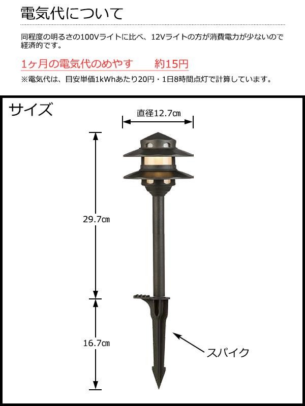 | 仕様 | 3WLED 色温度:3000K(電球色) 全光束:80ルーメン 電圧:12V 定格寿命:約40000時間 黒色 防雨型 LED交換不可 専用トランス及びケーブルが別途必要 メーカー指定以外の電源トランスは使用不可 |