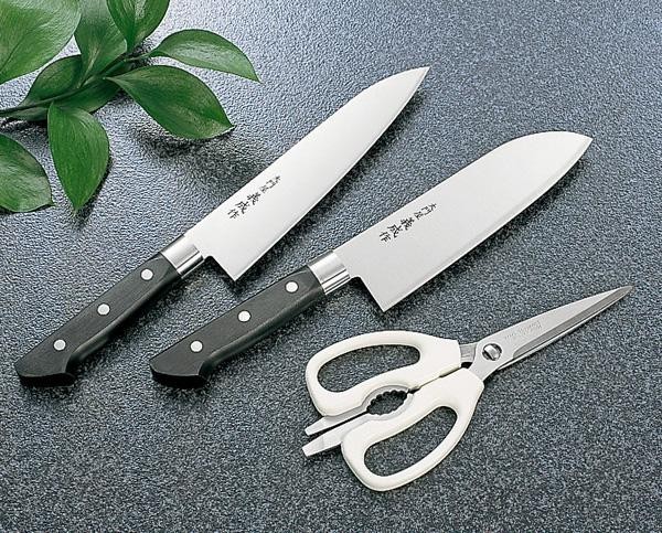 | 三徳庖丁・牛刀・キッチンバサミの3点セットです。三徳庖丁と牛刀はモリブデンバナジューム鋼使用で切れ味バツグン!!研ぎ直しも可能です。柄を密封し、水分をシャットアウトしているので、サビにくいです。キッチンバサミは、分解でき洗いやすいセパレート式。ギザ刃付で、すべらず切れます。 |