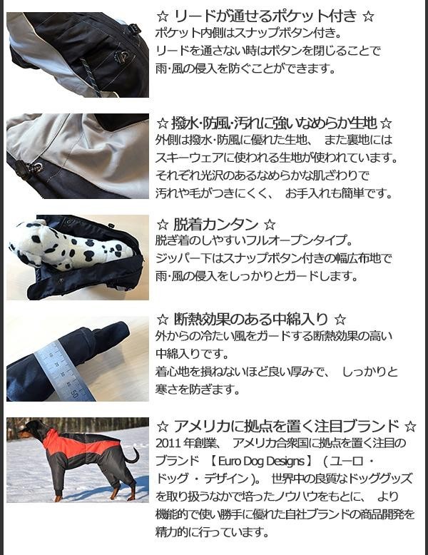 | 首から脚元まで全身をしっかりとカバーするスタイリッシュなデザインのペット用スノースーツ!!伸縮性のある柔らかな袖口のリブがワンちゃんの脚に優しくフィットし、下からのすきま風や雨の侵入を防ぎます。撥水・防風・汚れに強い生地はなめらかで、肌ざわりもよく毛がつきにくいのでお手入れも楽々♪断熱効果の高い中綿入りでほどよい厚みもあり、着ごこちを損なうことなくしっかりと寒さを防ぎます。 |