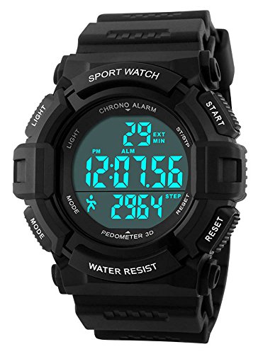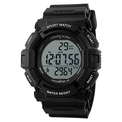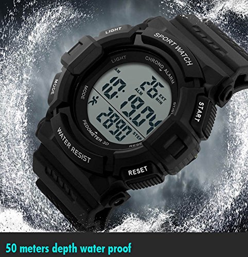 -. Feature : Multifunction Watch:Auto Date ,Alarm clock, Pedometer,Stopwatch, Calendar 50M Water Resistant,LED display,Shock Resistant,Back Light / Water-resistant to 50M / Soft and comfortable resin watch band,high hardness glasses with buckle / Japanese movement and battery lasts 2-3 years / Charming for all occasions. Amazing looking watch, a great gift for your relatives and friends