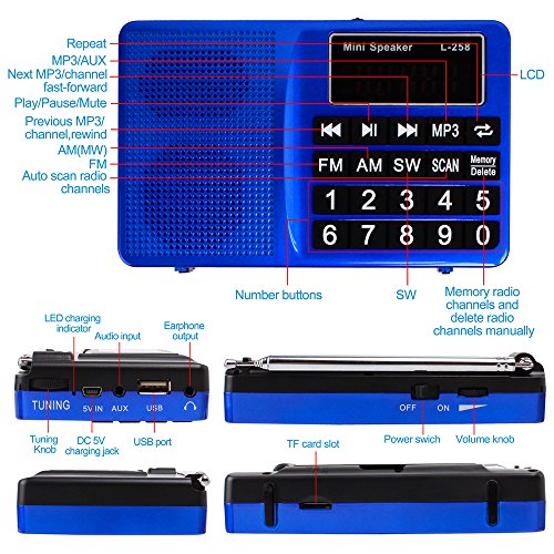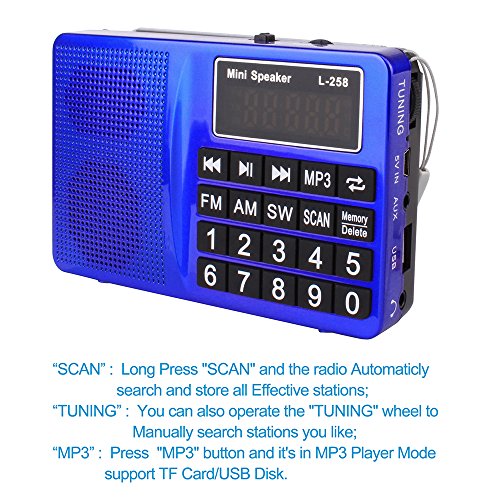 Studio : ohCome Publisher : ohCome Binding : Electronics Product Description The portable FM/AM/SW Radio has Large LED Display Screen, can be used as Mini Speaker 3.5mm Aux, MP3 Music Player support TF Card / USB Disk with Big Button, Simple to use, Suitable for home, outdoor, office and other places. Exquisite design, convenient to carry, excellent for walkers, hikers, campers, backpackers. Auto/Manual Search: 1.In AM/FM/SW mode, long Press "SCAN" and the radio Automaticly search and store all Effective stations and then you just need to choose the saved stations; 2.You can press 0-9 buttons to choose exact station, you can also operate the "TUNING" wheel to Manually search stations you like and the button "Memory/Delete" can manually Store or Delete the stations. Features: **Bass diaphragms, high quality sound; **The design of the Big buttons, convenient for your operation, especially for the elder; **The support on the back of the radio, make sure to place the radio more convenient and safe; **Support connectting the external audio equipment as 3.5MM AUX loudspeaker. **As a gift, ideal for children in the birthday party, especially for father and mother in the Father's Day and Mother's day; Specifications: *FM: 87.5-108 MHz; *AM: 522-1710 KHz; *SW: 2300-21950 KHz; *Decoding: 8-320KBPS; *Speaker: 40mm, 3ohms, 5W; *Power supply: 1000mA Lithium battery (included); *Charging voltage: DC 5V, 500mA; *Size 4.9 x 3.1 x 1 in; Package Included: 1 x FM/AM/SW Radio; 1 x Lithium battery; 1 x USB changing cable; 1 x AUX 3.5MM cable; 1 x English Manual.