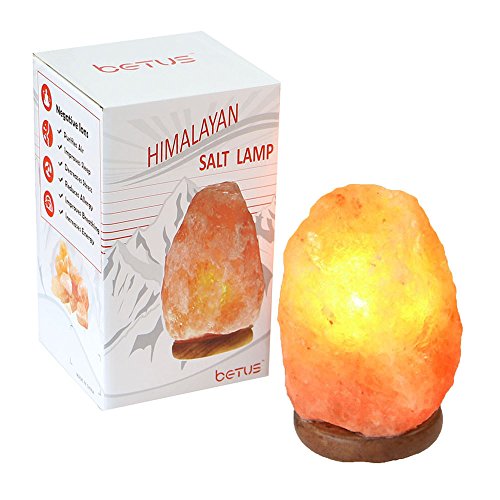 Betus [Natural Crystal] Himalayan Salt Lamp Hand Carved on Wood Base with Dimmable Cord and Light Bulb - 6 to 7 Inches Height, 3 to 5 Pounds