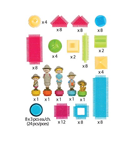 -. Feature : Set contains 113 pieces. Including 4 people; (1) father (1) mother (1) brother (1) sister and (1) dog. / Eight (8) functional wheels add motion to objects, providing additional options to young builders. / Bristle blocks stick together at any angle for creative building possibilities. / Bright colors and fun shapes stimulate young minds and build motor skills. / • Battat Bristle Blocks are recommended for ages 2 and up.