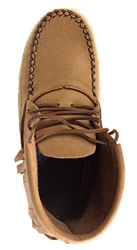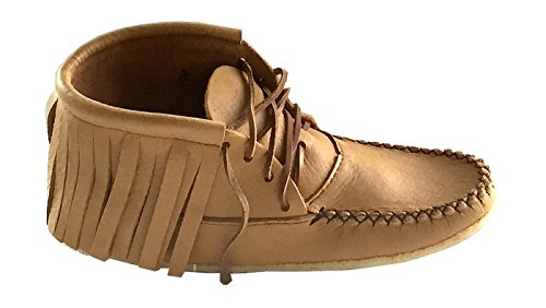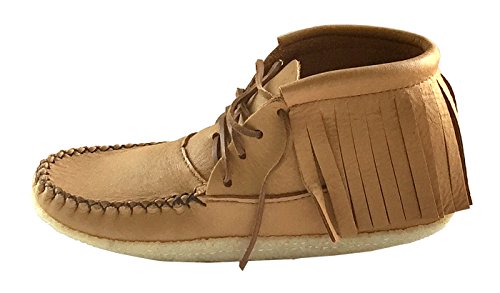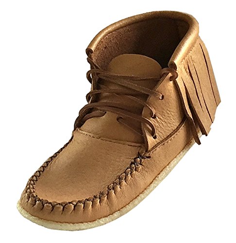 Binding : Apparel Product Description These women's outdoor moccasin ankle boots provide traditional style and ultimate comfort. They are authentic Native American handmade moccasin boots crafted from genuine moose hide leather in a maple tan color. They have a thick foam insole sewn between the layers of leather providing a cushy sole to walk on. They have an outdoor crepe sole making them ideal for casual use outside. They have a stylish fringe all the way around the opening with rawhide laces that go all the way up. These ladies ankle moccasin boots are 5½" tall from the ground up and they have a double hand-stitched vamp. They are available in women's size 5-10 and are made in Canada by an aboriginal company called Bastien Industries offering 100% Huron Native made products. 0
