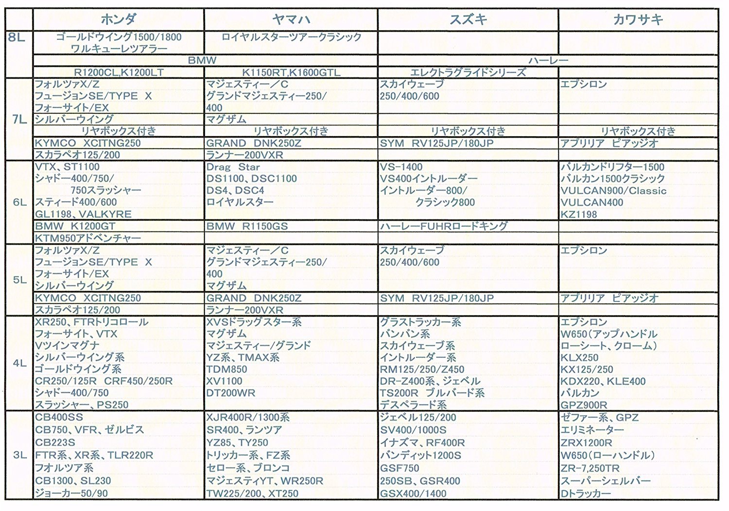 Approximate adaptation model: 250cc ~ Big scooter: