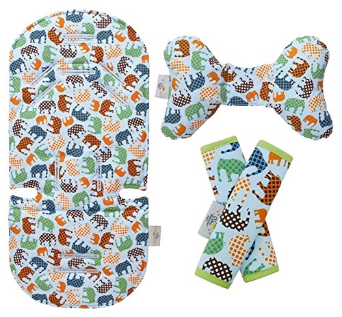 Baby Elephant Ears 3 Piece Stroller Set ~ Seat Liner, Support Pillow & Strap Covers (Blue Elephant)