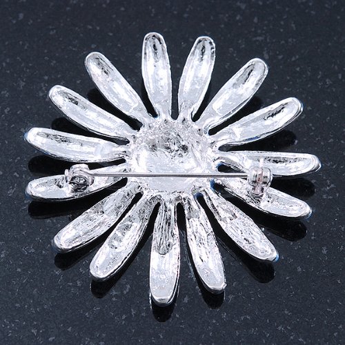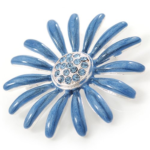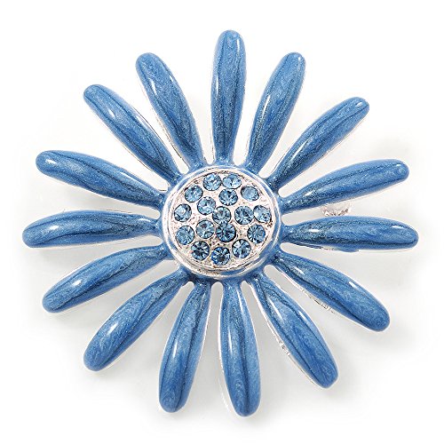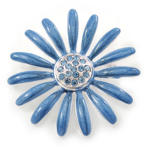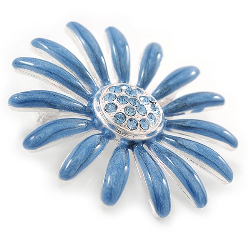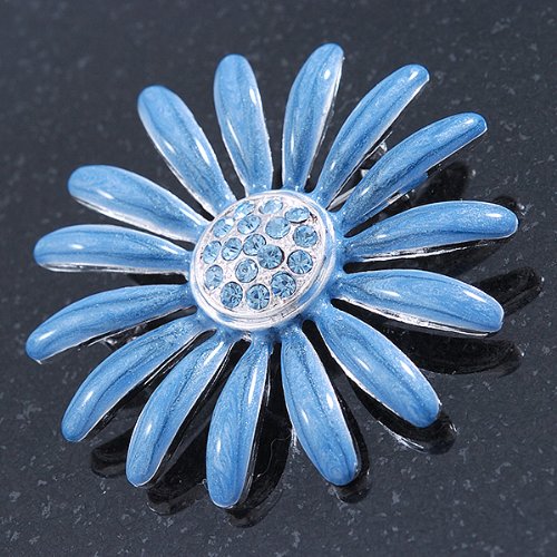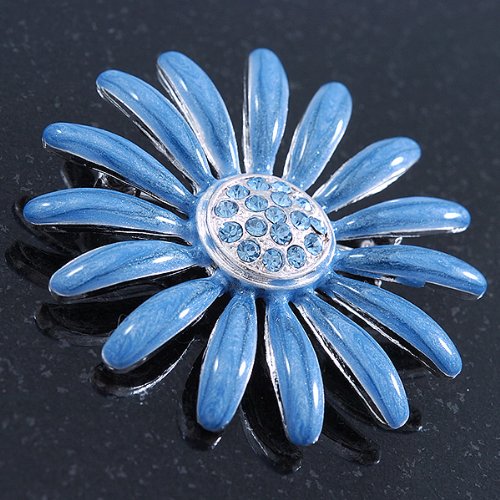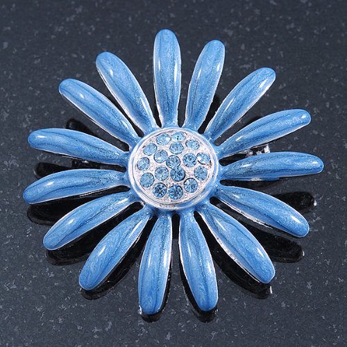 Live in full bloom. Fresh and fashionable, this brooch is glossy and lively, and offers a sweet touch of spring-anytime of year. Featuring a large daisy shape design, crafted in silver plated metal and covered with light blue enamel detailing. The centre of the flower accented with sky blue crystals for a dash of sparkle. The brooch measures about 50mm in diameter. Secures with a flag pin and revolver clasp. Fantastic gift idea - Christmas, birthday, anniversary, mothers day, etc.Feature