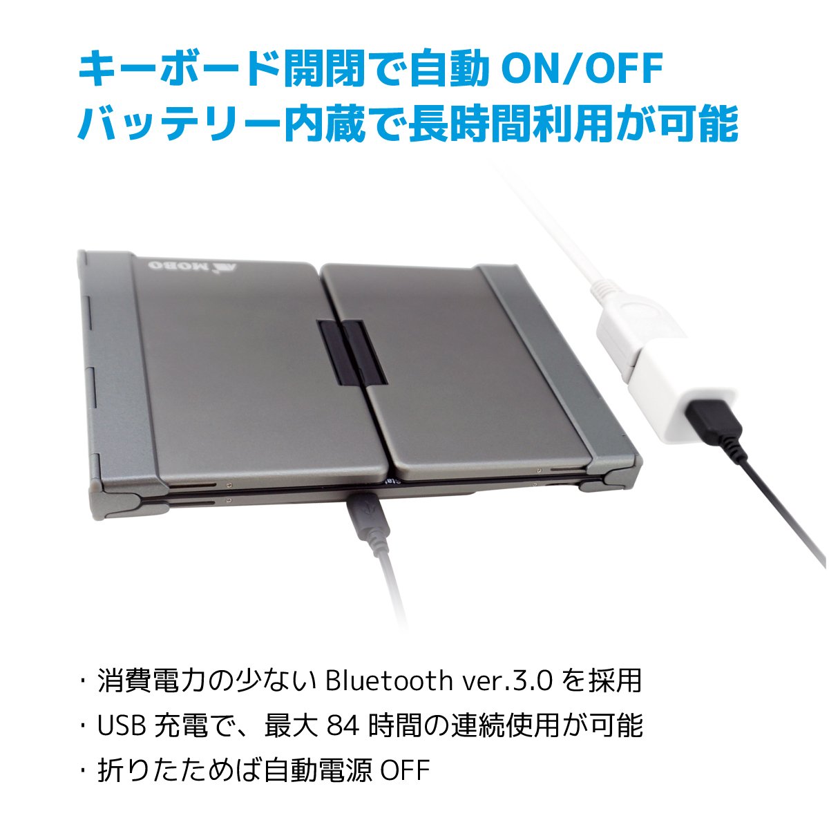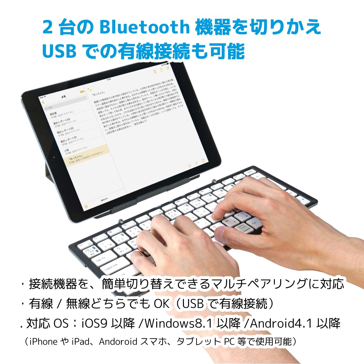 配列:日本語配列(83キー) キースイッチタイプ:パンタグラフ(アイソレーションタイプ) キーピッチ:19mm(一部 16.6mm / 14.3mm) Bluetooth規格:Bluetooth ver.3.0 有線接続:可能(USBインターフェース) 充電時間/連続使用時間:最大約4時間/ 最大84時間 対応OS:iOS9以降 / Windows8.1以降 / Android4.1以降